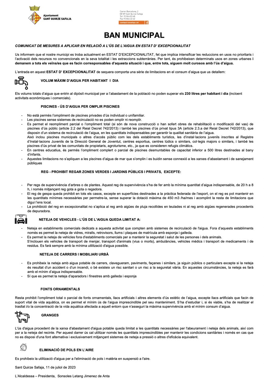Us informem que el nostre municipi es troba actualment en ESTAT D’EXCEPCIONALITAT, fet que implica intensificar les reduccions en usos no prioritaris i l’activació dels recursos no convencionals en la seva totalitat i les extraccions subterrànies. Per tant, és prohibeixen determinats usos en zones urbanes i demanem a tots els veïns/es que es facin corresponsables d’aquesta situació i que, entre tots, siguem molt curosos amb l’ús d’aigua.