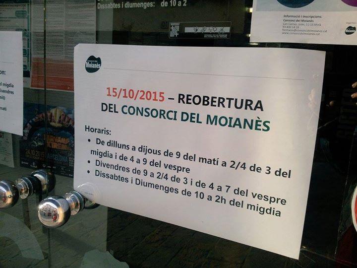 Us comuniquem que el Consorci del Moianès ha reobert els seus serveis des de dijous 15 d’octubre del 2015.