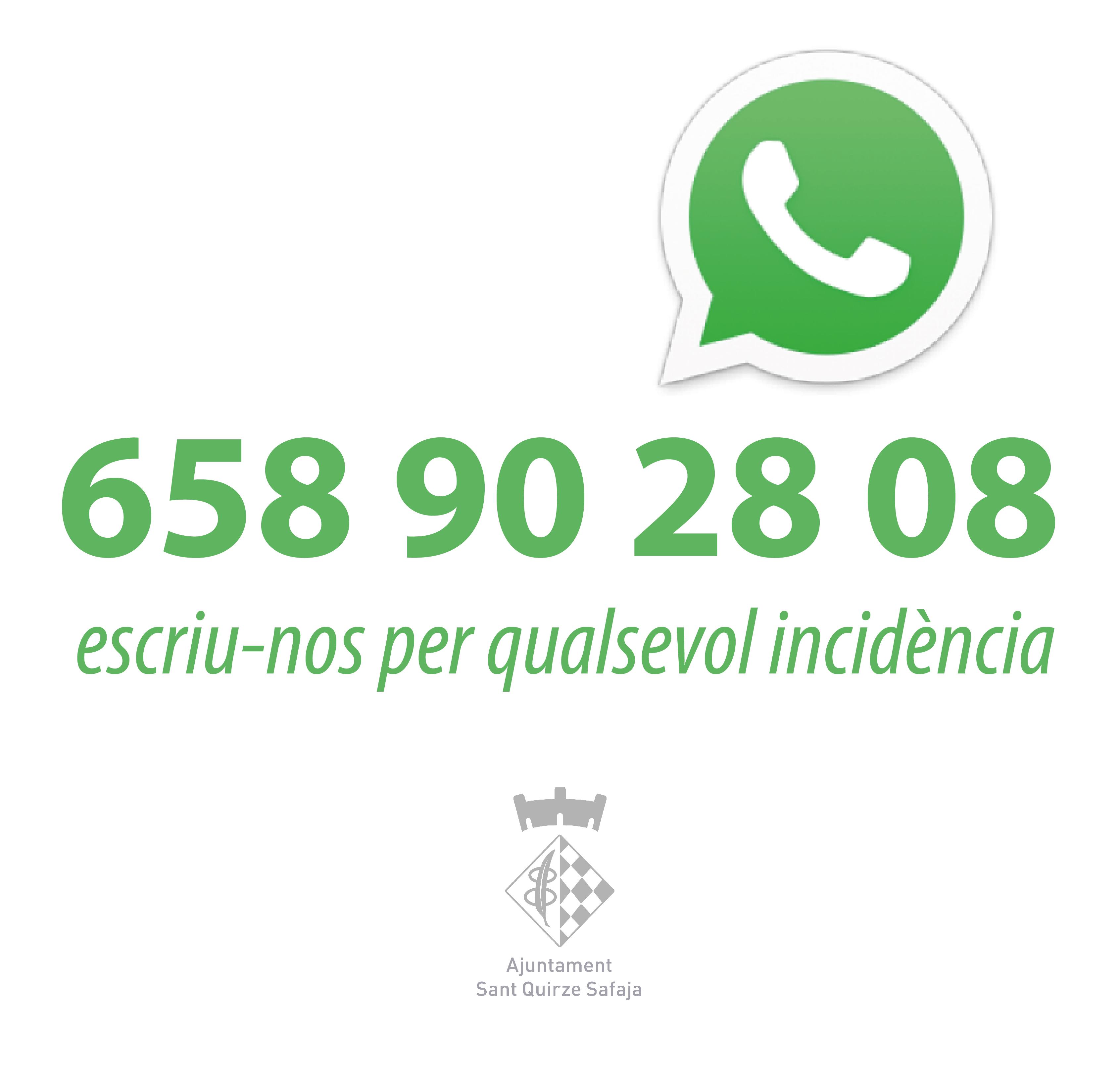 Posem a disposició del ciutadà de Sant Quirze aquest número de telèfon per tal de poder-nos fer arribar de forma ràpida i directa qualsevol incidència que pugui veure a la via pública. La forma més fàcil de comunicació és a través d’un missatge via Whatsapp.