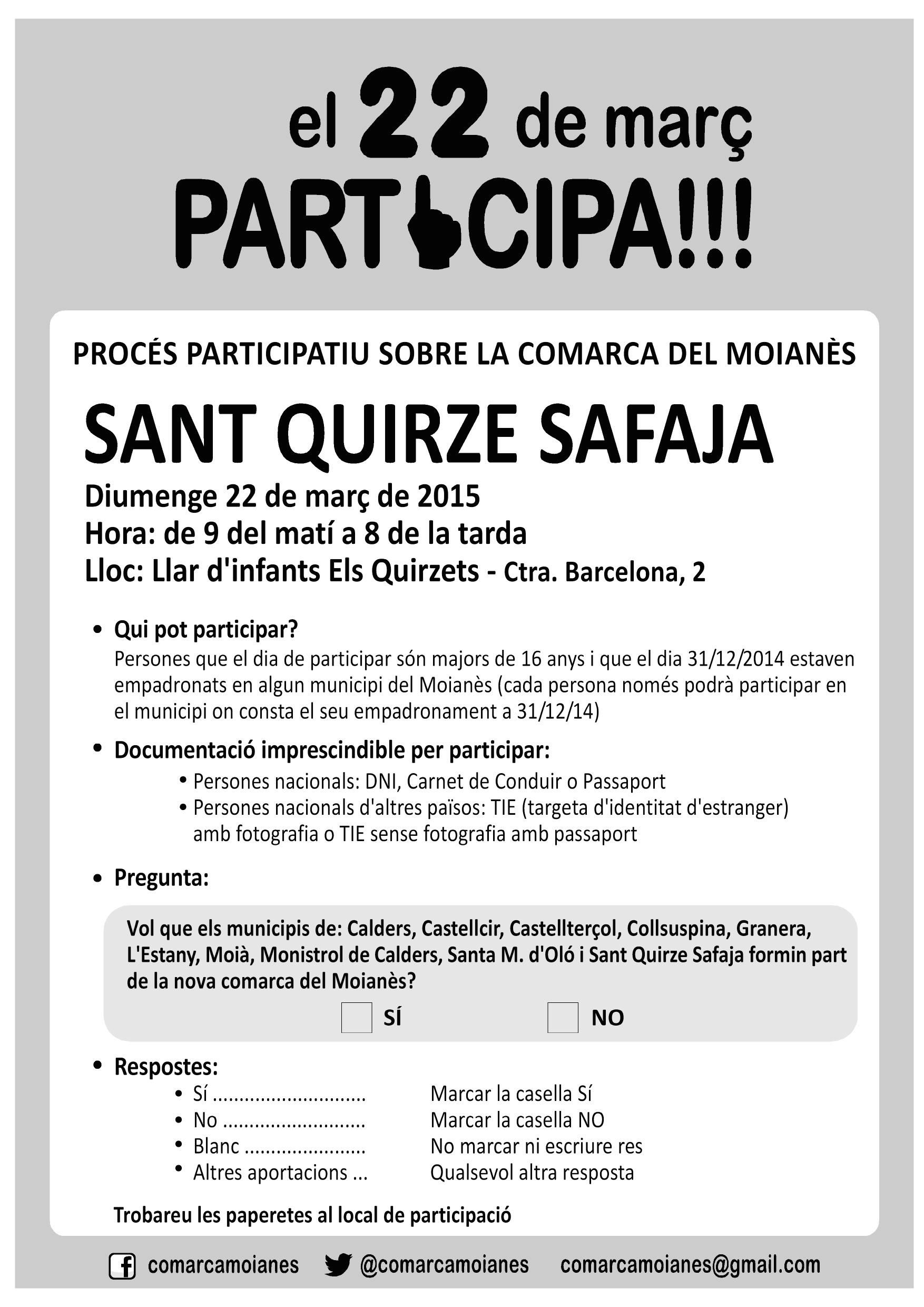 Es tracta d’un moment històric pel territori del Moianès de manera que, tot i ser un procés participatiu no vinculant, és molt important la màxima participació de totes les persones que hi estan cridades. Com més fermament demostrem la voluntat d’aquest territori, més fàcil ho tindrà el Parlament de Catalunya per a decidir-ne el seu futur.